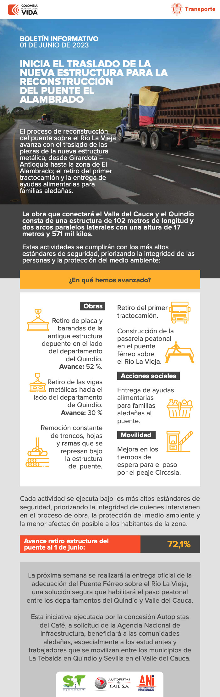 Junio 01 de 2023El proceso de reconstrucción del puente sobre el Río La Vieja avanza con el traslado de las piezas de la nueva estructura metálica, desde Girardota – Antioquia hasta la zona de El Alambrado; el retiro del primer tractocamión y la entrega de ayudas alimentarias para familias aledañas.