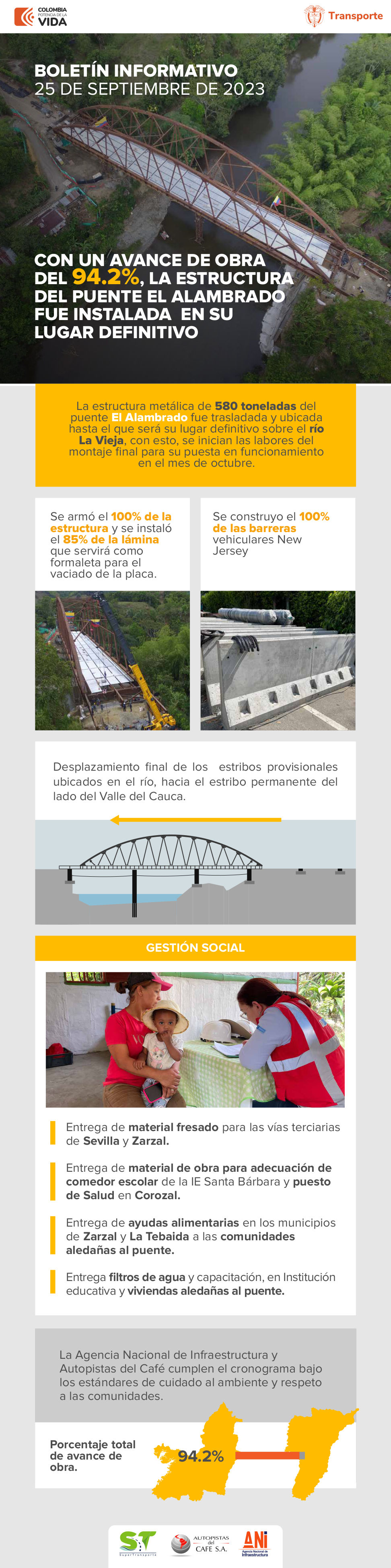 Septiembre 26 de 2023La estructura metálica de 580 toneladas del puente El Alambrado fue trasladada y ubicada hasta el que será su lugar definitivo sobre el río La Vieja, con esto, se inician las labores del montaje final para su puesta en funcionamiento en el mes de octubre.