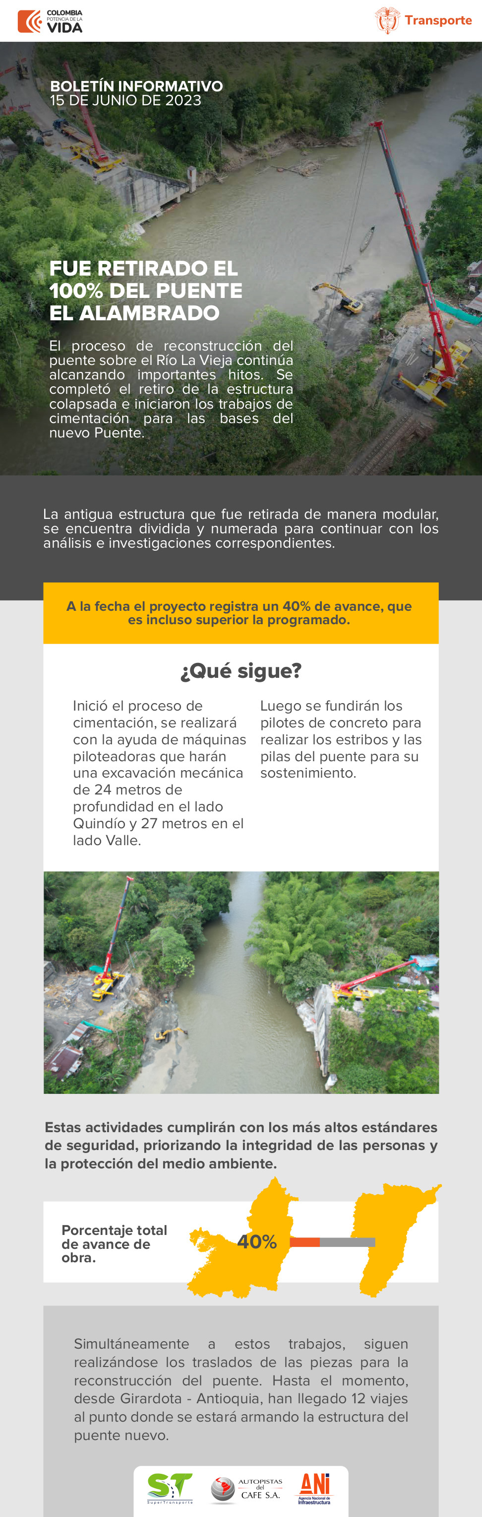 Junio 15 de 2023El proceso de reconstrucción del puente sobre el Río La Vieja continúa alcanzando importantes hitos. Se completó el retiro de la estructura colapsada e iniciaron los trabajos de cimentación para las bases del nuevo Puente.