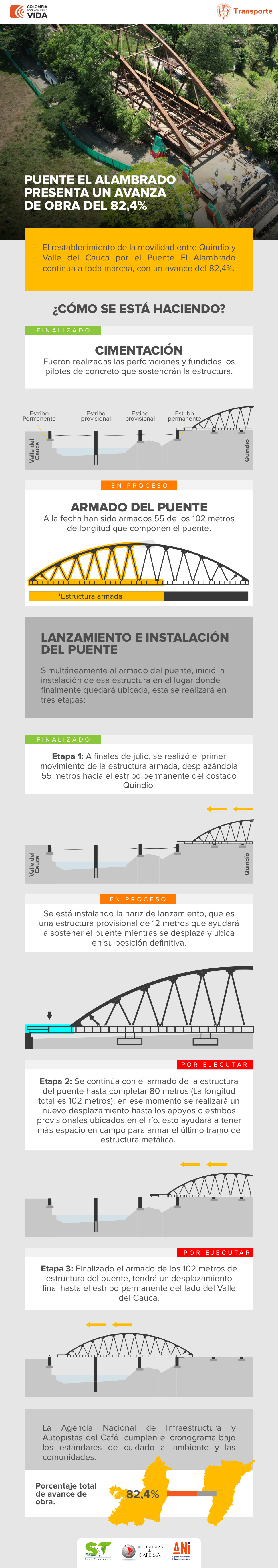 Agosto 15 de 2023El restablecimiento de la movilidad entre Quindío y Valle del Cauca por el Puente El Alambrado continúa a toda marcha, con un avance del 82,4%. La Agencia Nacional de Infraestructura y Autopistas del Café cumplen el cronograma bajo los estándares de cuidado al ambiente y las comunidades.