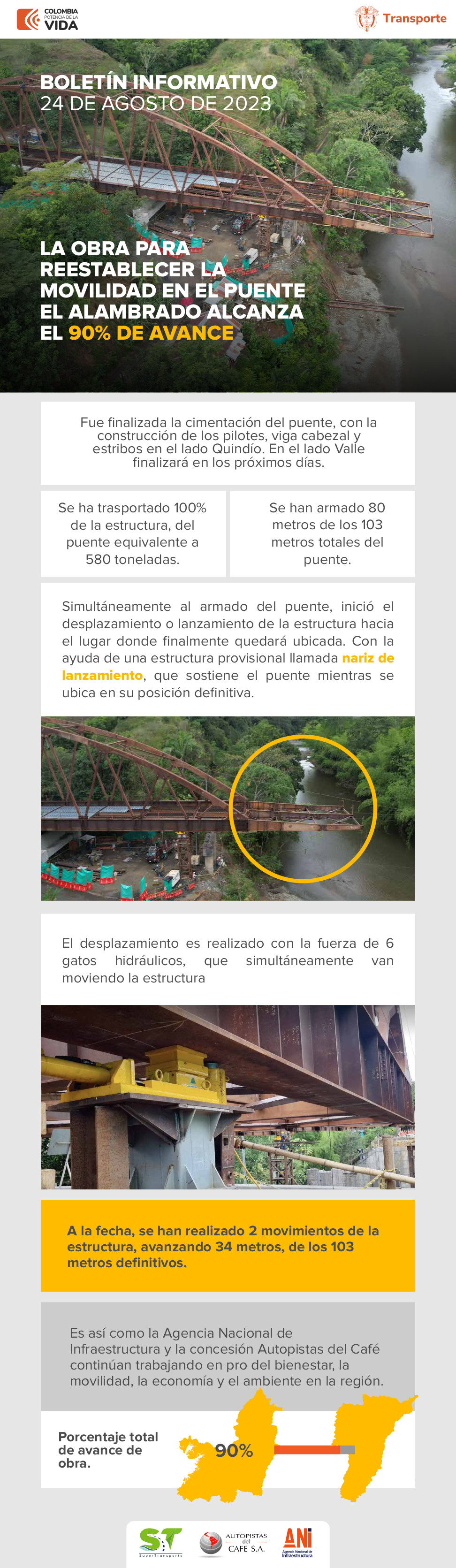 Agosto 24 de 2023Fue finalizada la cimentación del puente, con la construcción de los pilotes, viga cabezal y estribos en el lado Quindío. En el lado Valle finalizará en los próximos días. Simultáneamente al armado del puente, inició el desplazamiento o lanzamiento de la estructura hacia el lugar donde finalmente quedará ubicada, esto con la ayuda de una estructura provisional llamada nariz de lanzamiento, que sostiene el puente mientras se ubica en su posición definitiva.